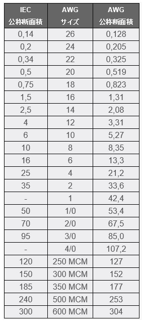 ※AWGとのサイズ比較は、下表にてご確認下さい