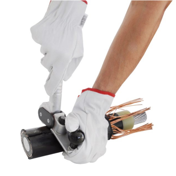 外径45㎜以上の太径ケーブルのケーブルシース剥ぎ取り工具。 太径の作業に困難を極める特別高圧ケーブルまでのシース剥ぎ取りを、 安全かつ効率よく行うために設計されています。 替刃は両刃仕様のため、簡単な作業でストレスのない施工が可能です。 ケーブルのサイズ別に使い分けが必要ありません。