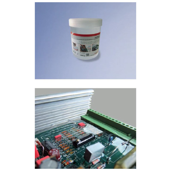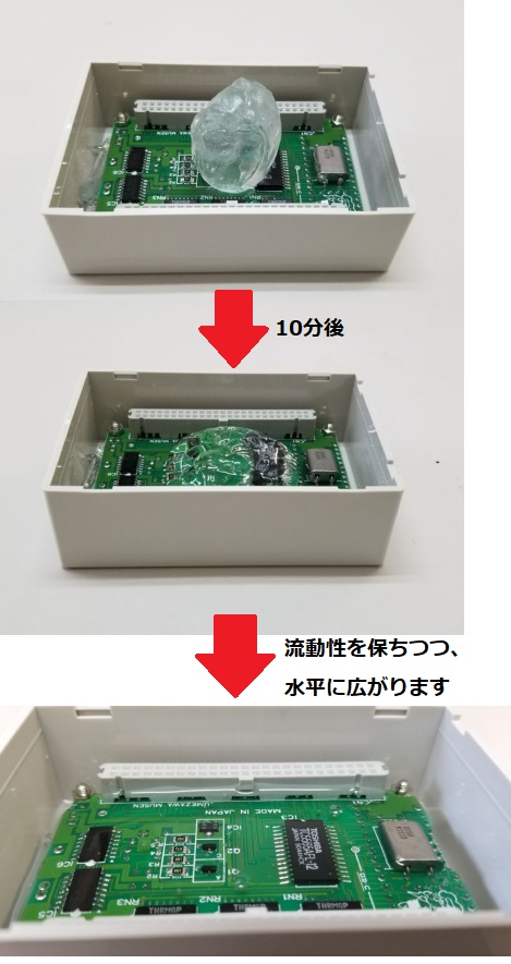 永久流動性、セルフレベリング1液性高粘度ジェル。そのまま投入することで施工完了。特性を活かし、精密備品の保管(防塵)や基板への防湿防塵などを可能とします。