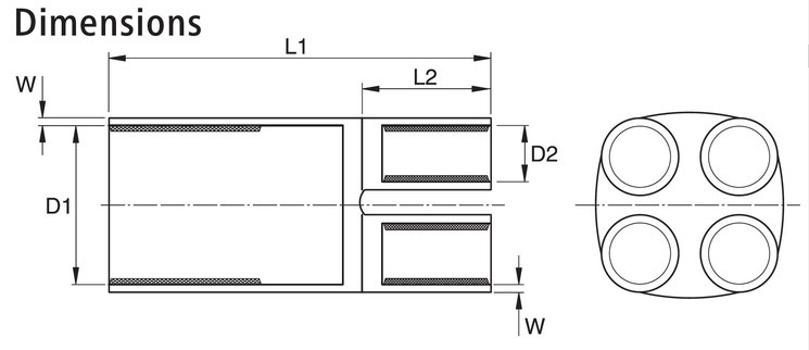 ※詳細寸法はカタログをご覧ください ※推奨適用範囲:ケーブル外径がD1、D2共に収縮前寸法×80%~収縮後寸法×120%の範囲内であること