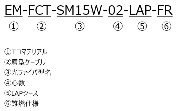 層型光ケーブル。ファイバ:マルチモード(GI 50/125)、OM2、高屈曲型。環境配慮形耐燃性タイプ(EM)。 EM層型