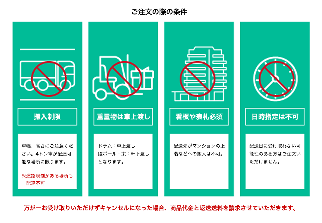 ケーブルのご購入時に重量物になる場合がございます。事前に以下の条件が満たしているかご確認の上ご購入ください。また、弊社より配送先の荷卸し設備の有無確認や納期のご相談でお電話にてご連絡させていただく場合がございますので、ご了承ください。もし購入前にご不明点がございましたらお気軽にお問い合わせください。