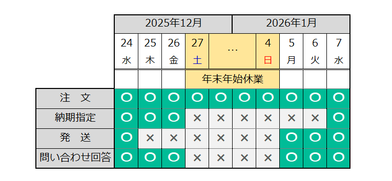 ■休業期間 :12月27日(土) ~ 1月4日(日) ■納期指定不可 :12月27日(土) ~ 1月6日(火) ■発送対応 :最終 12月24日(水) / 再開 1月5日(月) ■問い合わせ回答:最終 12月26日(金) / 再開 1月5日(月) ■受付時間 :午前9時 ~ 午後5時 ※休業期間・土日祝は対応不可